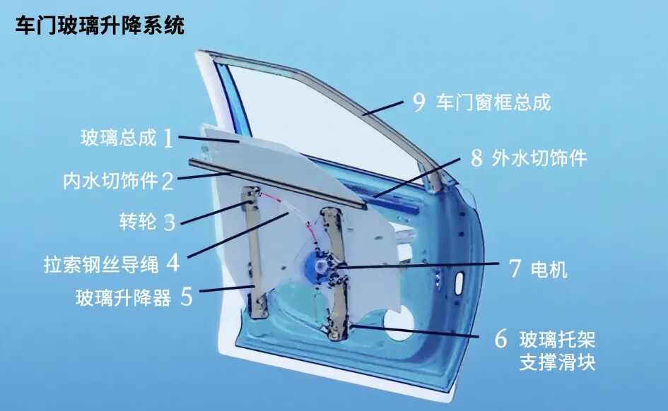 玻璃升降器是控制汽车车窗玻璃升降的核心装置,现代汽车一般都采用电动玻璃升降器,它主要由玻璃升降器总成、电机、导绳、导向板、玻璃托架支撑滑块等组成,其主要功能包括以下几个方面: